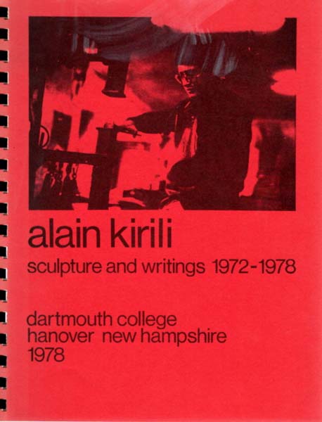 Kirili, Alain – Jan van der Marck (Herausgeber): Alain Kirili: Sculpture. A Record of Past Work and Writings, 1972 – 1978. Erste Auflage. Hanover (NH). Dartmouth College Museum and Galleries. 1978. 28,3 x 22 cm. 62 S. Illustrierter OKarton in Spiralbindung. Vorderdeckel etwas lichtspurig und mit kleiner Verwischung. Innen papierbedingt etwas aufgehellt. Sonst gutes Exemplar. Durchgehend mit schwarz-weiß Abbildungen versehen. Katalog zur gleichnamigen Ausstellung des französischen Künstlers Alain Kirili (* 29. August 1946 in Paris; † 19. Mai 2021 in New York City) in der Beaumont-May Gallery, Hopkins Center, in Hanover (New Hampshire) vom 13. Januar bis zum 19. Februar 1978.