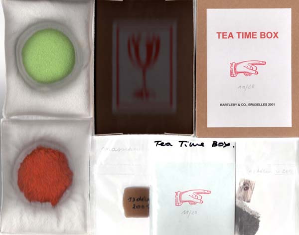 Guignard, Agnès / Caty Wyllems / Christine Dupuis / Edith Schöbel / Matthias Vanneste – Thorsten Baensch & Christine Dupuis (Herausgeber): Tea Time Box. [sucré]. Erste Auflage. Brüssel. Bartleby & Co. 2001. 17,5 x 13 x 3,4 cm. [16] unpaginierte S. OBroschur mit illustriertem OPapierumschlag in beschrifteter Plastiktüte, eingelegt mit diversen Beigaben in OPappkarton mit montierter Titelei. Sehr gutes Exemplar. Auf 20 numerierte Exemplare (hier Exemplar 11/20) limitierte Künstleredition, herausgegeben von Thorsten Baensch & Christine Dupuis von Bartleby & Co. Diese besteht aus einem broschierten Rezeptbuch in französischer Sprache mit von Hand überarbeiteten fotokopierten Abbildungen, einem Stück Marzipan (eingeschweißt in durchsichtigem Plastik), betitelt „massepain à manger?“, einem Teebeutel mit Darjeeling vom 13. Dezember 2001 sowie zwei Topflappen mit hellgrünem und rotem Kunstfellflecken. Auf dem Innendeckel von Thorsten Baensch & Christine Dupuis handschriftlich signiert. Die Buchbindearbeiten besorgte die Buchbinderei Mergemeier in Düsseldorf. Bartleby & Co., gegründet vom Künstler Thomas Baensch, widmet sich seit 1995 der Publikation von Künstlerbüchern und -editionen.