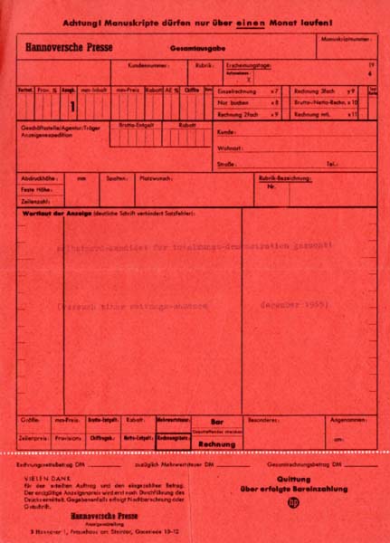 Ulrichs, Timm: selbstmord-kandidat für totalkunst-demonstration gesucht! (versuch einer zeitungs-annonce dezember 1965). Erste Auflage. [Hannover]. [Hannoversche Presse] / Selbstverlag. 1965. 29,6 x 21,3 cm. 1 Blatt. Blatt mittig gefaltet. Sonst sehr gutes Exemplar. Frühes Auflagenobjekt des deutschen Total-Künstlers Timm Ulrichs, bestehend aus einem roten Vordruck der Hannoverschen Presse für eine Anzeigenschaltung nebst angehängter Quittung über erfolgte Bareinzahlung (Perforierung). Eine maschinenschriftliche Aufschrift (in Durchschrift) mit dem Text „selbstmord-kandidat für totalkunst-demonstration gesucht! (versuch einer zeitungs-annonce dezember 1965).“.