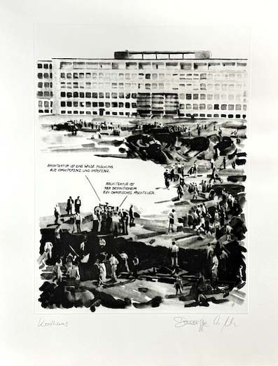 Dellbrügge, Christiane / de Moll, Ralph: Koolhaas. Hamburg-Langenhorn. Griffelkunst e. V. 1997. 53 x 41,9 cm (Blattgröße); 41 x 30,5 cm (Bildmotiv). 1 Blatt. Sehr gutes Exemplar. Von der Hamburger Griffelkunst-Vereinigung herausgegebene, schwarzweiße Heliogravüre, auf schwerem Hahnemühle-Büttenpapier, des deutsch-amerikanischen Künstlerpaares Christiane Dellbrügge (*1961) und Ralph de Moll (*1961). Von beiden Künstlern recto unterhalb des Bildmotives in Bleistift handschriftlich signiert und betitelt „Koolhaas“. WVZ Griffelkunst Nr. 287 A2.