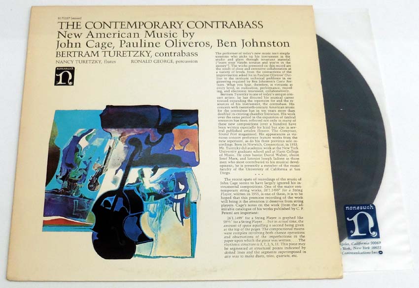 Cage, John / Pauline Oliveros / Ben Johnston: THE CONTEMPORARY CONTRABASS. New American Music by John Cage Pauline Oliveros, Ben Johnston. BERTRAM TURETZKY, contrabass. NANCY TURETZKY, flutes. RONALD GEORGE, percussion. [Schallplatte / Vinyl Record]. New York. Nonesuch Records. 1987. 31,5 x 31,5 cm. Schallplatte, OKunststoff-Innenhülle. OKarton-Cover. Cover gering berieben und insgesamt etwas nachgedunkelt sowie mit kleinem Besitzaufkleber von Privat am Backcover (Very Good+); Schallplatte in sehr gutem Zustand (Near Mint). Insgesamt gutes Exemplar. Nonesuch – H-71237 (stereo).