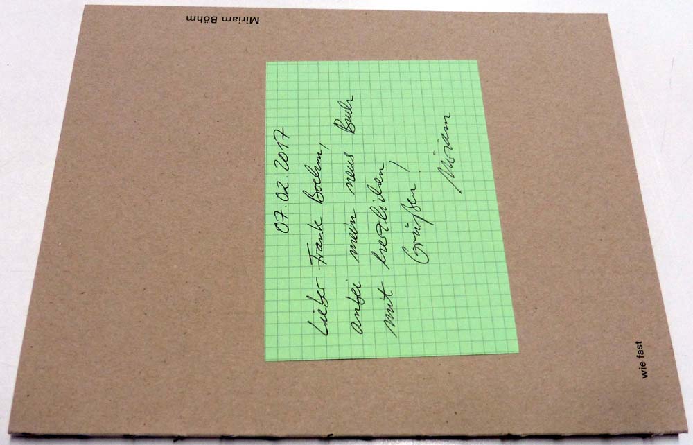 Böhm, Miriam: wie fast. [Rudolf-Scharpf-Galerie, Ludwigshafen, 24. September-4. Dezember 2016]. 1. Auflage. Berlin. argobooks. 2016. 27 x 21 cm. 68 S. OKarton. Sehr gutes Exemplar. Texte in Deutsch und Englisch. Durchgehend mit meist farbigen Abbildungen versehen. Beiliegend: Karte (Karierter Karton) mit kurzem handschriftlichen Gruß sowie verso Adresse der Künstlerin, signiert mit „Miriam“, datiert 07.02.2017.