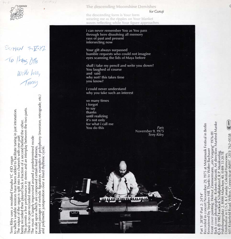 Riley, Terry: Descending Moonshine Dervishes. [Schallplatte/Vinyl – 12“]. München. Kuckuck Schallplatten / E.R.P. Musikverlag. 1982. 31,5 x 31,5 cm. OVinyl. OKarton-Cover. Cover etwas berieben. Schallplatte in gutem bis sehr gutem Zustand. Cover und Platte Very Good+. Kuckuck – 047. Handschriftliche Widmung (″Bremen 7.V.82, to Hans Otte with Love, Terry“) von Terry Riley auf dem Backcover.