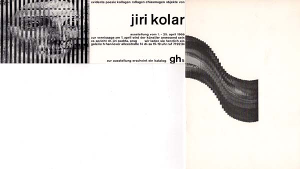 Kolár, Jiri: Galerie M. E. Thelen. Erste Auflage. Essen. Galerie M. E. Thelen. 1966. 24 x 16,2 cm (Katalog); 9 x 27 cm. [2] unpaginierte S.; 1 Blatt. Illustrierter OKarton (ungeheftet). Notiz „Katalog folgt“ auf Beilage. Katalog papierbedingt minimalst lichtspurig und angestaubt, sonst noch sehr gutes Exemplar. Einladungskarte in Katalogform zu einer Ausstellung des tcheschichen Künstlers Jirí Kolár (1914 – 2002) in der Essener Galerie M. E. Thelen im Jahre 1966. Mit einem Text von Udo Kultermann in deutscher Sprache. Beiliegend eine Einladungsklappkarte der Galerie h in Hannover mit einer schwarzweissen Abbildung zu einer Ausstellung des Künstlers im gleichen Jahr.