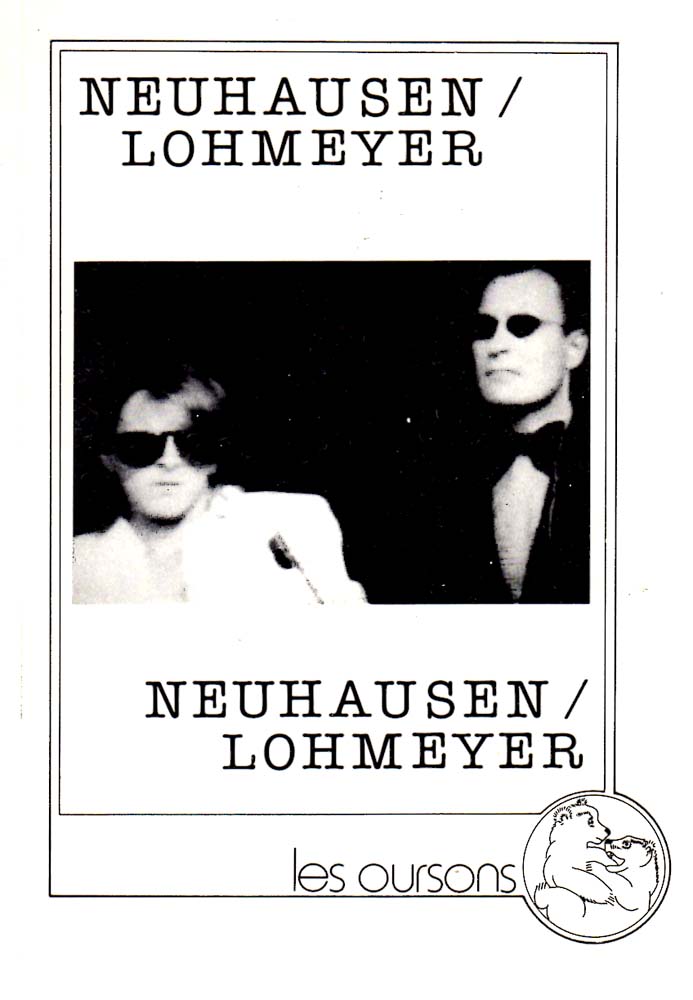 Neuhausen/Lohmeyer: NEUHAUSEN/LOHMEYER. 1. Auflage. Schermbeck – Bricht. Les oursons Kunstkontor Christoph Hellmann Galerie. 1984. 21 x 14,5 cm. [210] S. OKarton. Widmung auf Vorsatz, sonst gutes Exemplar. Edition ours ; 2. Künstlerbuch. Enthält ausschnitte aus einem mehrstündigen Video-Selbstinterview der Künstler sowie ein Gespräch zwischen Neuhausen/Lohmeyer und „SALON“-Herausgeber Gerhard Theewen. Abbildungen sind nur als leere Kästen vorhanden und müssen vom Betrachter imaginär über die Bildunterschriften gefüllt werden.