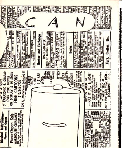 Voss, Jan: CAN. 1. Auflage. Chicago Books. 1979. 14 x 11 cm. 28 unpaginierte S. OKarton. Sehr gutes Exemplar. Künstlerbuch. Durchgehend mit schwarz-weiß Abbildungen versehen.
