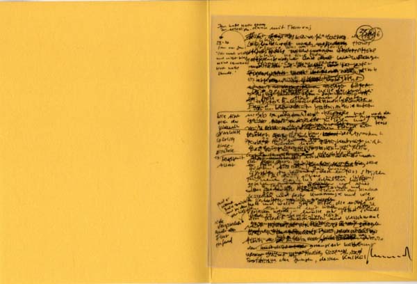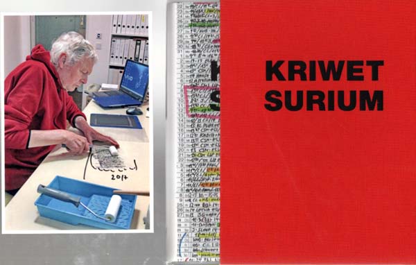 Kriwet, Ferdinand: Kriwet Surium. Erste Auflage. Brauweiler. Verlag Tino Graß. 2018. 25,3 x 18,7 cm. 413 S. Blindgeprägter OLeinenband mit illustriertem OUmschalg mit OLeinenschuber; illustrierter OPappfolder. Sehr gutes Exemplar. Durchgehend mit schwarz-weißen Abbildungen versehen. Aus einer Auflage von 20 Vorzugsausgaben (1 – 17 / 18 – 20 a. p.) im Schuber mit signierter Unikatarbeit sowie zusätzlich einer vom Künstler handsignierten und datierten Fotografie, die ihn bei der Erstellung einer der Unikatarbeiten zeigt. Hier Exemplar 16/20. Die Arbeit nebst Foto eingelegt in einen gelben Pappfolder, dieser verso signiert und nummeriert. Die Unikatarbeit besteht aus zwei übereinander montierten, durchsichtigen, vom Künstler mit Textbildern bedeckten Plastikblättern. Auf der Titelseite vom Künstler mit schwarzem Faserschreiber handsigniert.