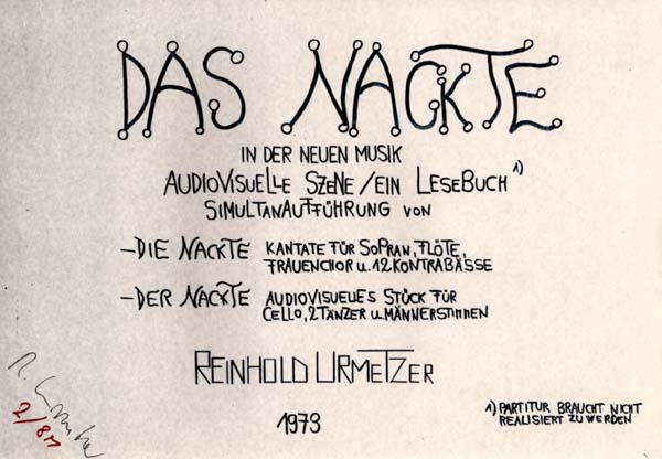 Urmetzer, Reinhold: Das Nackte in der Neuen Musik. Audiovisuelle Szene / Ein Lesebuch. Simultanausführung von – Die Nackte. Kantate für Sopran, Flöte, Frauenchor u. 12 Kontrabässe. Der Nackte. Audiovisuelles Stück für Cello, 2 Tänzer u. Männerstimmen. Erste Auflage. o. O. o. V. [Eigenverlag]. 1972 – 1973. 30 x 42,5 cm [Blätter]; 32 x 45,9 cm [Mappe]. 21 S.; 11 S. Private, geklebte Pappmappe; Blätter lose eingelegt. Mappe etwas berieben und mit Einrissen; Blätter minimal angestaubt. Sonst gutes Exemplar. Partitur eines zweiteiligen, audiovisuellen Stückes, erschienen in einer hektografierten und vom Komponisten handkolorierten, handsignierten und nummerierten Auflage von acht Mappen, hier Exemplar 2/8 M[appen]. Zusätzlich auf der Innenlasche der Mappe handschriftlich gewidmet und mit einer kleinen Notation versehen. Reinhold Urmetzer, geboren am 13.5.1950 in Saarbrücken mit deutsch-französischem Hintergrund, ist ein Multi-Media-Artist. Er studierte Musik, Germanistik und Philosophie in Saarbrücken, Stuttgart und Tübingen, u. a. Komposition bei Erhard Karkoschka und Philosophie bei Karl Otto Apel. Er spielte vier Jahre lang im Ensemble Neue Musik Saarbrücken sowie später in den Rockgruppen Puma und Zoom Orchestra.