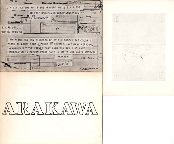 Arakawa, Shusaku: Arakawa Shusaku. 1965. Go Tsuki. Minami Gallery. Tokyo. Erste Auflage. Tokyo. Minami Gallery. 1965. 30,3 x 20,8 cm. [8] unpaginierte S.; [3] unpaginierte S. Illustrierter OKartonfolder. Blätter papierbedingt stärker nachgedunkelt und lichtspurig. Folder etwas angestaubt. Sonst ordentliches Exemplar. 1965 von der Tokyoter Galerie Minami herausgegebener Ausstellungskatalog der japanischen Malers Shusaku Arakawa. Texte in japanischer Sprache auf losem, dünnem Papier in Leporelloform. Im gleichen Jahr fand in Düsseldorf bei Schmela eine Ausstellung des Künstlers statt. Auf dem Vorderdeckel der Stempel der Galerie Alfred Schmela. Selten. Beiliegend drei Einladungskarten der Galerie Schmela zu Arakawa-Ausstellungen in den Jahren 1964, 1965 und 1966.