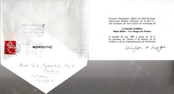 Gerdes, Ludger: Maler-Bilder – Les Images du Peintre. Maison de la Culture et de la Communication. Espace art contemporain. [Signierte Einladungskarte]. Saint-Etienne / Düsseldorf. Maison de la Culture et de la Communication. Espace art contemporain. 1988. 11,3 x 15,9 cm. [2] unpaginierte Blätter. Gute Exemplare. Von Ludger Gerdes handschriftlich gewidmete und signierte Einladungskarte (recto eine schwarzweisse Abbildung einer Arbeit von Gerdes) nebst zugehöriger Bestellkarte für eine Katalogedition zur Ausstellung im französischen Saint-Etienne im Jahre 1988. Beiliegend der postalisch gelaufene Briefumschlag. Auf diesem die von Gerdes geschriebene, humoristische Absenderadresse „Donald Duck, Dagobertstraße, Stiege III. Entenhausen“.