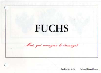 Broodthaers, Marcel: FUCHS. Mais qui mangera le fromage? Berlin. Marcel Broodthaers. 1974. 10,5 x 14,8 cm. 1 Blatt. OKarton-Karte. An der linken Seite gelocht, sonst aber noch sehr gutes Exempar. Im Preis berücksichtigt. Postkarte als Antwort Marcel Broodthaers an Lothar Baumgarten und Michael Oppitz anläßlich der Ausstellung „Hommage an M.B.“ in der Galerie Konrad Fischer. Die Einladungskarte Baumgartens lautete auf „RAABE“, die Ausstellung sollte als eine Referenz an die Ausstellung „Der Adler vom Oligozän bis heute“ 1972 in Düsseldorf verstanden werden. Broodthaers antwortete auf der beidseitig bedruckten Postkarte: „An L. Baumgarten und . Oppitz pour saluer die Ausstelulng für die Sinne und den Verstand“, Berlin, 20-5-74 Marcel Broodthaers.