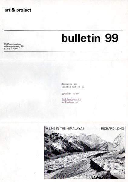 Long, Richard – Geert van Beijeren / Adriaan van Ravesteijn (Herausgeber): art & project. Bulletin 99. A Line in the Himalayas. Richard Long. Erste Auflage. Amsterdam. art & project. [1976]. 29,6 x 21 cm. [4] unpaginierte S. Papierbedingt minimal nachgedunkelt. Zweifach gefaltet für den Versand. Mit aufgedruckter Adresse. Sonst gutes Exemplar. Bulletin 99 der Amsterdamer Galerie „art & project“ aus dem Jahre 1976 zu einerArbeit Richard Longs. Innen und recto jeweils eine schwarzweiße Abbildung einer Aufnahme von Longs Werk in situ. [Vgl. allgemein AK Art & Project Bulletins 1 – 156. September 1968 – November 1989. Cabinet Gallery, London / 20th Century Archives, Cambridge / Christophe Daviet-Thery Paris. London / Cambridge / Paris 2011].
