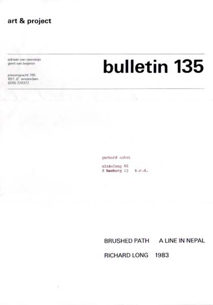 Long, Richard – Geert van Beijeren / Adriaan van Ravesteijn (Herausgeber): art & project. Bulletin 135. Brushed Path. A Line in Nepal. Richard Long 1983. Erste Auflage. Amsterdam. art & project. 1983. 29,6 x 21 cm. [4] unpaginierte S. Papierbedingt minimalst nachgedunkelt. Zweifach gefaltet für den Versand. Mit aufgedruckter Adresse. Sonst gutes Exemplar. Bulletin 135 der Amsterdamer Galerie „art & project“ aus dem Jahre 1983 zu einer Arbeit Richard Longs. Innen eine schwarzweiße Abbildung einer Aufnahme von Longs Werk in situ. [Vgl. allgemein AK Art & Project Bulletins 1 – 156. September 1968 – November 1989. Cabinet Gallery, London / 20th Century Archives, Cambridge / Christophe Daviet-Thery Paris. London / Cambridge / Paris 2011].