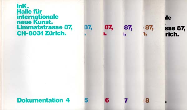 Sauer, Christel (Herausgeberin): InK. Halle für international neue Kunst. Limmatstrasse 87, CH-8031 Zürich. Dokumentation 1 – 8. Information. Erste Auflage. 9 Bände. Zürich. Halle für international neue Kunst. 1978 – 1981. 25 x 19 cm. [59], 52, 69, 67, 77, 51, 55, 77, [20] S. Illustrierte OKartonbände. Einbände teilweise etwas lichtrandig und nachgedunkelt. Sonst gute bis sehr gute Exemplare. Durchgehend mit schwarz-weißen Abbildungen versehen. Ausstellungsdokumentationen, bestehend aus acht kartonierten Bänden sowie einem Informationsheft der 1978 von Urs Raussmüller gegründeten Halle für internationale neue Kunst in Zürich an der Limmatstrasse. Gezeigt wurden die wichtigsten Künstlerinnen und Künstler der damaligen Avantgarde, darunter A. R. Penck, Robert Ryman, Sol Lewitt, Jannis Kounellis, Georg Baselitz, Richard Long, Lawrence Weiner, Bruce Nauman, Gerhard Richter, Lothar Baumgarten, Bernd und Hilla Becher, Robert Mangold, Sigmar Polke, Blinky Palermo, Donald Judd, Gilbert & George, Joseph Beuys, Marcel Broodthaers, Daniel Buren, Hans Peter Feldmann, Martin Disler, Robert Barry, Douglas Huebler, Jan Dibbets, Hanne Darboven, John Baldessari, Giulio Paolini, Ed Ruscha, Bruce McLean, Mario Merz, Gerhard Merz, Wolfgang Laib, Carl Andre und Dan Flavin.