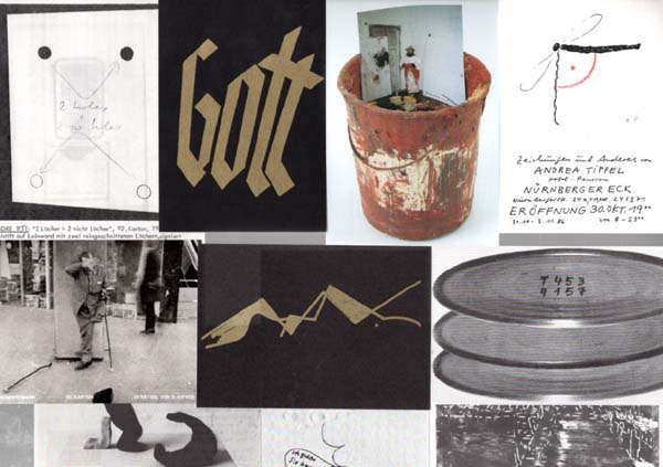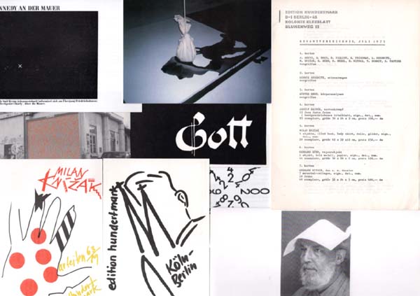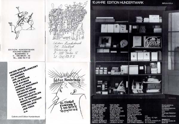 Hundertmark, Armin (Herausgeber): Konvolut Einladungskarten und diverse Ephemera. Berlin / Köln. Galerie und Edition Hundertmark. 1972 – 1997. Diverse Formate. Ca. [96] unpaginierte Blätter. Karten stellenweise gering angestaubt und berieben, Kataloge teilweise gefaltet, Karten zum Teil postalisch gelaufen. Wenige Ephemera mit Notizen versehen. Insgesamt noch sehr gutes Exemplar. Durchgehend mit schwarz-weißen und einigen farbigen Abbildungen versehen. Interessantes Konvolut der Galerie und Edition Hundertmark, bestehend aus ca. 40 Einladungskarten zu Ausstellungseröffnungen in der Galerie, Einzel- und Grußßenausstellungen. Teilweise Klappkarten (Claus Böhmer und Robert Filliou, diese mit einer Ausstanzung). Die Karten zumeist querrechteckig in unterschiedlichen Größen, einige postalisch gelaufen. Die Künstler der Galerie sind u. a. Claus Böhmler, Otto Muehl und Günther Brus, Monika Bartholomé, Chris Reinecke, Takako Saito, Alice Hutchins, Yoko Ono, Shozo Shimamoto, Robert Filliou, Endre Tót, Bernhard Johannes Blume, Hermann Nitsch, Konrad Balder Schäuffelen und Milan Knizak. Dazu eine Einladungspostkarte zu einer Ausstellung in der Galerie Remont in Warschau mit einem handschriftlichen 11-zeiligen Text von Armin Hundertmark nebst Signatur; eine Einladungskarte zu einer Ausstellung von Andrea Tippel mit einer kleinen, von der Künstlerin monogrammierten Überarbeitung einer abgedruckten Zeichnung. Zusätzlich diverse kleine Kataloge des Editionsprogrammes von Hundertmark aus den siebziger Jahren sowie Ankündigungen der verschiedenen Kartons und Schuber der Edition. Dazu ebenfalls noch eine von Bernhard Johannes Blume in Bleistift signierte und datierte Postkarte „Köln-Berlin“ sowie die objekthaft gestaltete Einladungsklappkarte zur Ausstellung „Buchobjekte“ bei Hundertmark im Jahre 1994. Zusammen in Papp-Archiv-Box.