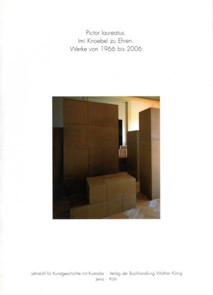 Knoebel, Imi – Carmen Knoebel / Franz-Joachim Verspohl (Herausgeber): Pictor laureatus. Imi Knoebel zu Ehren. Werke von 1966 bis 2006. Erste Auflage. Köln. Verlag der Buchhandlung Walther König. 2006. 29 x 21 cm. 92 S. Illustrierter OKlappkarton. Gutes Exemplar. Minerva. Jenaer Schriften zur Kunstgeschichte. Band 16. Durchgehend mit meist farbigen Abbildungen versehen. Ausstellungskatalog des Lehrstuhls für Kunstgeschichte mit Kustodie der Friedrich-Schiller-Universität Jena, anlässlich der Ausstellung „Pictor Laureatus. Imi Knoebel zu Ehren. Werke von 1966 bis 2006“, Universitätsforum, ehemaliges Thüringer Oberlandesgericht und Frommannhaus im Frommannschen Anwesen, 23. Mai bis 4. August 2006. Texte in deutscher Sprache.