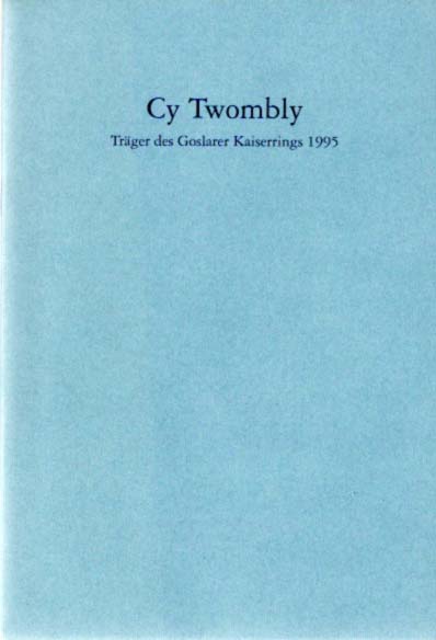 Twombly, Cy: Zur Verleihung des Goslarer Kaiserrings am 21. Oktober 1995 und zur Ausstellung im Mönchehaus-Museum für moderne Kunst Goslar. Erste Auflage. Goslar. Kulturamt der Stadt. 1995. 20,1 x 13,6 cm. [13] unpaginierte Blätter. Klammergehefteter OKarton. Sehr gutes Exemplar. Durchgehend mit schwarz-weißen Abbildungen versehen. Texte in deutscher Sprache.