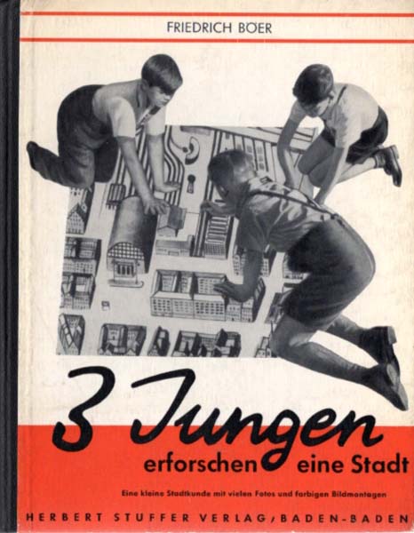 Böer, Friedrich: Drei Jungen erforschen eine Stadt. Eine kleine Stadtkunde mit vielen Fotos und farbigen Bildmontagen. Zeichnungen von Werner Bürger und Erich Krantz. Zweite Auflage (14.-20. Tausend): Baden-Baden. Herbert Stuffer Verlag. 1954. 21,7 x 16,9 cm. 28 S.; [4] unpaginierte Blätter (Faltplan). Illustriertes OHalbleinen. Kleines montiertes Papierchen auf Vorsatz vorne. Einband etwas angestaubt und leicht nachgedunkelt. Minimalste Randläsuren. Innen wenig lichtrandig, sonst gutes Exemplar. Durchgehend mit schwarz-weißen und orangeroten Abbildungen versehen. Texte in deutscher Sprache. Nachkriegsausgabe des erstmals 1933 erschienenen modernistischen, edukativen Jugendbuchklassikers. [Vgl. Sammlung Hürlimann 1100; Klotz I, 563/6; Murken-Stuffer 16].