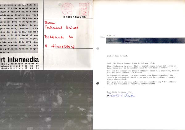 Kriwet, Ferdinand: Korrespondenzarchiv und Konvolut diverser Einladungskarten und Ephemera. Verschiedene Orte. 1971 – 1974. Verschiedene Formate. [ca. 460] unpaginierte Blätter; [ca. 175] unpaginierte Blätter. Private Aktenordner. Papiere teilweise stärker nachgedunkelt, berieben und randläsurig. Karten, Briefe und Ephemera linksseitig gelocht. Sonst ordentliche bis gute Exemplare. Interessantes und ungewöhnliches Korrespondenzarchiv des Düsseldorfer Künstlers und Hörspielautors Ferdinand Kriwet (1942 – 2018) mit zahlreichen Durchschriften von Briefen des Künstlers sowie Briefen an ihn. Dabei befinden sich private und geschäftliche Schreiben ebenso wie Briefe an Galerien, Museen, Fernseh- und Radiosender, Verlage, Architekturbüros, Zeitungen und Zeitschriften, Stadtverwaltungen und befreundete Künstler und Autoren. Unter den Adressaten finden wir Timan Osterwold, Manfred Leve, Rudi Stern, Horst Tress, L. Fritz Gruber, Jürgen Hohmeyer, Rolf-Gunter Dienst, Thomas Grochowiak, Werner Schmalenbach, Paul Wember, Friedrich Becker, Axel Hecht und Maurizio Nannucci. Zu den Ephemera und Einladungskarten von befreundeten Künstlerkollegen, die Kriwet gesammelt hatte, gehören auch Anzeigen der Düsseldorfer Eat Art Galerie, der art intermedia sowie des Kaiser Wilhelm Museum zu Krefeld. Viele Karten mit schwarzweißen und farbigen Abbildungen, teilweise Leporellos und kleine Broschüren. Alle Blätter und Karten linksseitig gelocht und gesammelt in zwei privaten Aktenordnern. Das Konvolut deckt den Zeitraum von 1971 bis 1974, mit einem Schwerpunkt im Jahre 1973, ab. Die meisten Schreiben mit deutschen Absendern (Schwerpunkt Düsseldorf), wenige mit schwedischen, amerikanischen, niederländischen und französischen.