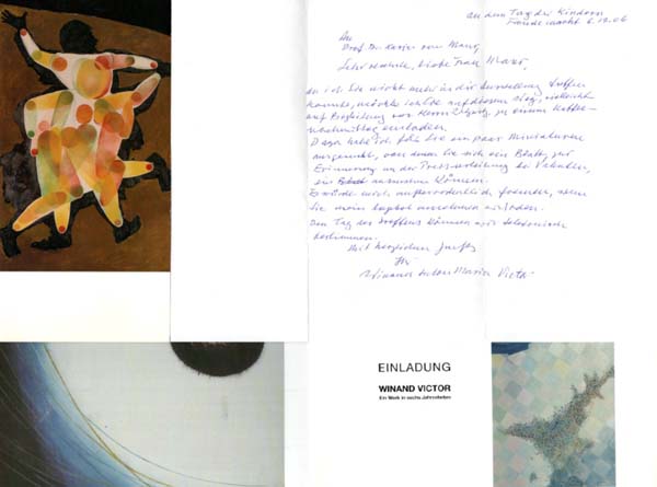 Victor, Winand: Konvolut Einadungskarten und Brief. Reutlingen. 2006 – 2007. 2 [5] unpaginierte Blätter. Gute bis sehr gute Exemplare. Kleines Konvolut von einem 20-zeiligen, handschriftlichen Anschreiben des deutschen Künstlers Winand Victor (1918 – 2014) an eine deutsche Kunsthistorikerin, von diesem signiert und datiert. Dabei drei Einladungskarten zu Ausstellungen des Künstlers. Die Karten jeweils mit einer farbigen Abbildung nach einer Arbeit Victors. Eine der Klappkarten mit einem 15-zeiligen Text nebst Signatur des Künstlers. Beiliegend der von Victor handschriftlich adressierte, postalisch gelaufene und geöffnete Briefumschlag.
