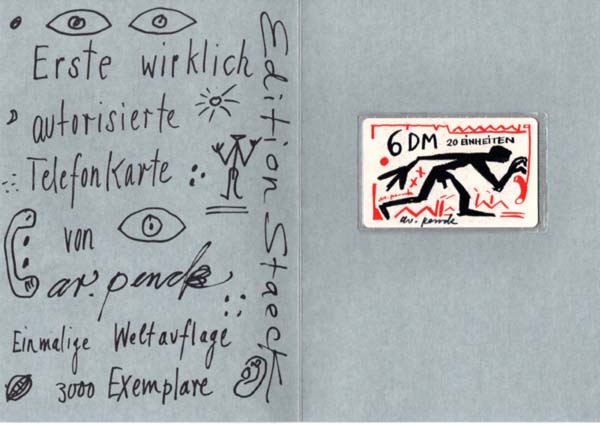 Penck, A. R. [d. i. Ralf Winkler]: Rufnot. [Telefonkarte]. Heidelberg. Edition Staeck. o. J. 21 x 14,8 cm; 8,6 x 5,5 cm (Karte). [1] unpaginierte S. Illustrierte OKlappkarte mit Umschlag der Edition Staeck. Kleines Fleckchen Karte verso. Sonst noch sehr gutes Exemplar. „Erste wirklich autorisierte Telefonkarte von ar. penck. Einmalige Weltauflage 3000 Exemplare“. Herausgegeben von der Edition Staeck in Heidelberg. Wert der Karte „6 DM“ (20 Einheiten). Vom Künstler auf der Karte in schwarzem Faserschreiber handsigniert.