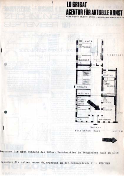 Logrigat. Agentur für Aktuelle Kunst. Filme – Bilder – Objekte – Grafik. 8 München 23 – Viktoriastr. 19. München. Logrigat. 1971. 29,8 x 21 cm. [5] unpaginierte Blätter. Papierbedingt nachgedunkelt und lichtrandig. Linksseitig gelocht und klammergeheftet. Sonst noch gutes Exemplar. Hektografierte Verkaufs- und Werbebroschüre der Galerie Logrigat in München mit Angeboten zu Arbeiten u. a. von Albers, Beuys, Christo, Fontana, Graubner, Mack, Richter, Rot, Tapies, Twombly und Wesselmann. Selten.