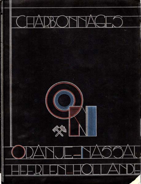 Charbonnages Oranje Naussau. Heerlen Hollande. Erste Auflage. Heerlen (Niederlande) Selbstverlag Zeche Oranje Nassau. o. J. [ca. 1933]. 30,6 x 23,2 cm. 48 S.; [12] unpaginierte Blätter mit Abbildungen. Graphisch Illustrierter OKarton. Einband angestaubt, berieben, mit Randläsuren und kleinen Einrissen. Rücken und Deckel recto mit kleiner Fehlstelle. Innen angestaubt und gleichmäßig nachgedunkelt. Sonst noch gutes Exemplar. Seltene französische Variante einer Firmenschrift der Heerlener Zeche Oranje Nassau, wohl aus dem Jahre 1933. Durchgehend mit schwarz-weißen Abbildungen nach Aufnahmen der Zechenanlage und des Betriebes und nach Zeichnungen von Jos [Jozef] Postmes versehen. Texte von D. J. Klink in französischer Sprache. Oranje Nassau I war ein Steinkohlebergwerk in Heerlen in der niederländischen Provinz Limburg und eine von vier Zechen der „N.V. Maatschappij tot Exploitatie van Limburgsche Steenkolenmijnen Oranje-Nassau“. In einer Auflage von 2000 Exemplaren erschienen.