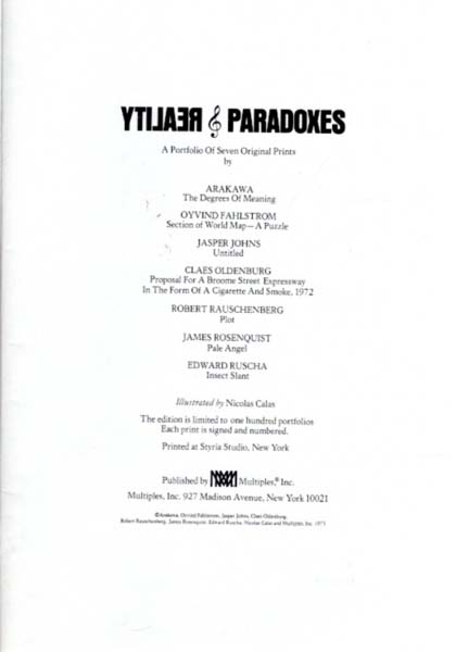 Realitiy Paradoxes. A Portfolio Of Seven Original Prints by Arakawa – Oyvind Fahlstrom – Jasper Johns – Claes Oldenburg – Robert Rauschenberg – James Rosenquist – Edward Ruscha. Illustrated by Nicolas Calas. Erste Auflage. New York. Multiples, Inc. / Castelli Graphics. 1973. 25,3 x 17,6 cm. [16] unpaginierte S. Klammergehefteter OKarton. Recto winzige Fleckchen, sonst noch sehr gutes Exemplar. Durchgehend mit schwarz-weißen Abbildungen versehen. Lose Broschüre zu einer bedeutenden Grafikmappe mit sieben auf 100 signierte und nummerierte Exemplare limitierten Arbeiten, diese herausgegeben von Multiples Inc. [Castelli Graphics] in New York im Jahre 1973 und gedruckt bei Styria Studio in New York. In vorliegender Broschüre sind alle Arbeiten in Schwarzweiß abgebildet.