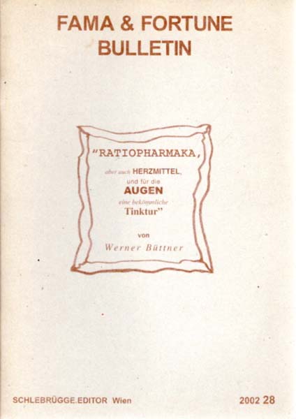 (Büttner, Werner) – Peter Pakesch / Johannes Schlebrügge (Herausgeber): Fama & Fortune Bulletin. Mai 2002. Heft 28. Ratiopharmaka. Erste Auflage. Wien. Schlebrügge.Editor. 1990. 24 x 17 cm. 47 S. Klammergehefteter OKarton. Insgesamt Einband etwas nachgedunkelt, sonst gutes Exemplar. Durchgehend mit farbigen Abbildungen nach Collagen von Werner Büttner versehen. Künstlerheft, herausgegeben von Peter Pakesch.Texte in deutscher Sprache.
