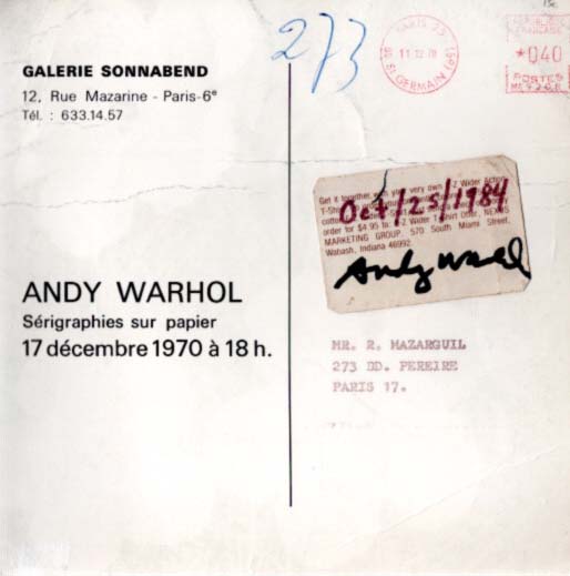 Warhol, Andy: Sérigraphies sur papier. 17 décembre 1970 à 18 h. Erste Auflage. Paris. Galerie Sonnabend. 1970. 17,9 x 17,9 cm. [1] unpaginiertes Blatt. Die gestempelte und mit einer handschriftlichen Zahl versehene Karte leicht angestaubt und verso etwas nachgedunkelt. Leichte Knickspur in der oberen Hälfte. Sonst gutes Exemplar. Postalisch gelaufene, quadratische Einladungskarte der Pariser Galerie Sonnabend aus dem Jahre 1970 für eine Einzelausstellung Andy Warhols mit Serigraphien. Verso auf einem Sticker von Warhol eigenhändig in schwarzem Filzschreiber signiert. Der Sticker trägt auch noch das handschriftliche Datum „Oct/25/1984“, in einem braunem Filzschreiber. Recto eine Farbabbildung einer Arbeit Warhols aus der „Flowers“-Serie von 1970, nach einer Grafik aus dem Jahre 1964.