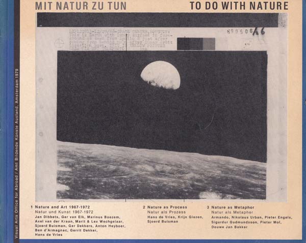 Mit Natur zu tun / To do with Nature. Erste Auflage. Amsterdam. Bildende Künste Ausland. 1979. 21 x 26 cm. [64] unpaginierte S. Illustrierter OKarton. Einbandkanten etwas nachgedunkelt und mit kleinen Bereibungen. Rücken etwas angegilbt. Sonst gutes Exemplar. Ausstellung Kölnischer Kunstverein (Klebeschild auf dem Vorsatzblatt), vom 25. 1. bis 9.3. 1980, organisiert von Gerhard von Graevenitz, Piet van Daalen, Jan van Munster und Gijs van Tuyl durchgehend mit Abbildungen versehen. Der Katalog gliedert sich in 3 thematische Abschnitte: 1.) Natur und Kunst 1967 – 1972. 2.) Natur als Prozess. 3.) Natur als Metapher. Text in deutscher und englischer Sprache.