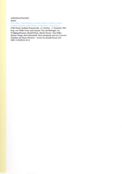 Groos, Ulrike (Herausgeberin): WIEDERAUFNAHME. Retake. Dave Allen, Andrea Bowers, Annika Eriksson, Rodney Graham, Christian Marclay, Hans Niehus, Adrian Piper, Slave Pianos. Erste Auflage. Frankfurt am Main. Revolver, Archiv für Aktuelle Kunst. 2001. 24 x 17,3 cm. 127 S. OKarton mit illustriertem, glanzkaschiertem OKlappkarton. Sehr gutes Exemplar. Durchgehend mit meist farbigen Abbildungen versehen. Katalog zur gleichnamigen Gemeinschaftsausstellung im NAK, Neuer Aachener Kunstverein, vom 14. Oktober bis zum 2. Dezember 2001. Texte in deutscher und englischer Sprache.