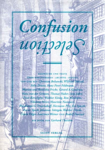 Theewen, Gerhard: Confusion. Selection. Gespräche und Texte über Bibliotheken, Archive, Depots. Von und mit Christian Boltanski, Wilfried Dörstel, Felix Droese, Hans-Peter Feldmann [u. a.] Dritte Auflage. Köln. Salon Verlag. 1996. 24 x 17,3 cm. 171 S. Illustrierter OKartonband mit illustriertem OKlappenumschlag. Mit illustriertem, semitransparentem Pergaminumschlag. Umschlag mit kleinem Einriss. Sonst noch sehr gutes Exemplar. Durchgehend mit schwarz-weißen Abbildungen versehen. Einzelband der von Gerhard Theewen, dem Verleger des Kölner Salon-Verlages herausgegebenen, kunstwissenschaftlich orientierten Reihe zu den Themen Sammeln, Archivieren, Ausstellen und Lehren. Mit zahlreichen Essays und künstlerischen Beiträgen ausgewiesener Fachleute, darunter Kuratoren, Galeristen, Kunstwissenschaftlern, Bibliothekare und Künstler. Eines von 500 Exemplaren.