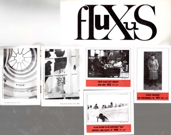 Moore, Peter: Konvolut Fluxussticker. [New York]. Ragged Edge Press / The Sticker Dude. 90er Jahre. Zwischen 8,8 x 10 cm und 9 x 22 cm. 6 unpaginierte Blatt. Gute bis sehr gute Exemplare. Kleines Konvolut von fünf Stickern unter Verwendung von Reproaufnahmen des britisch-amerikanischen Fotografen und Fluxus-Künstlers Peter Moore (1932 – 1993), autorisiert vom Estate of Peter Moore. Beiliegend ein Blatt mit einer typographischen Interpretation des Fluxus-Begriffes.