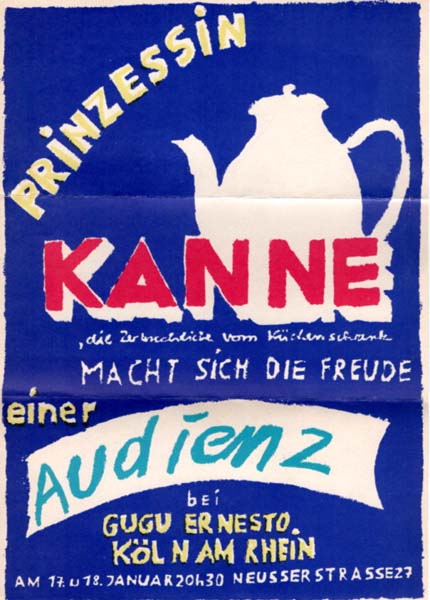 [Hofter, Sybille] / [Costard, Hellmuth] – Gugu Ernesto (Herausgeber): Prinzessin Kanne, die Zerbrechliche vom Küchenschrank macht sich die Freude einer Audienz bei Gugu Ernesto. Köln am Rhein. Am 17. u. 18. Januar 20h30 Neusser Strasse 27 [Ausstellungsplakat]. Köln. Galerie Gugu Ernesto. [1986]. 29 x 20,5 cm. 1 Blatt. Plakat zweifach gefaltet, dadurch leichte Bereibungen an den Falzen. Papierbedingt gleichmäßig etwas nachgedunkelt. Sonst gutes Exemplar. Kleines, farbiges Faltplakat auf starkem Papier zu einer Video-Ausstellung der deutschen Künstlerin Sibylle Hofter (*1967) und des deutschen Regisseurs Hellmuth Costard (1940 – 2000) in der Kölner Galerie Gugu Ernesto, am 17. und 18. Januar 1986. Der Entwurf der Einladungskarte ist von Sibylle Hofter.