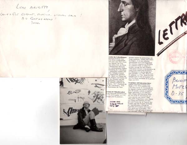 Gerz, Jochen: Handschriftliche Notiz, Porträtfoto und zum Briefumschlag umgestaltete Druckfahnen. [Paris]. o. V. 1981. 29,7 x 20,9 cm; 12,5 x 8,8 cm. 3 Blatt. Papier- und altersbedingt etwas angestaubt und nachgedunkelt. Postalisch gelaufener Briefumschlag gebrauchsspurig. Sonst noch guter Zustand. Vierzeiliger, handschriftlicher Gruß des deutschen Konzeptkünstlers Jochen Gerz nebst Signatur (″Jochen“) auf einmal gefaltetem DIN-A4-Briefpapier. Beiliegend ein schwarzweißer, matt glänzender Fotoabzug mit einem Porträt Gerz’ in seinem Atelier. Beiliegend eine zum Briefkuvert vom Künstler umgestaltete Druckfahne mit der gestempleten Adresse von Gerz.