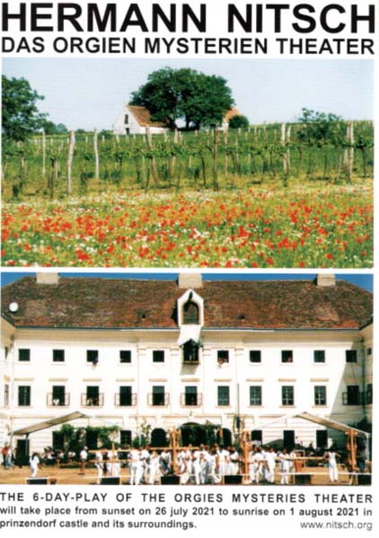 Nitsch, Hermann: Das Orgien Mysterien Theater. The 6-day-play of the Orgies Mysteries Theater will take place from sunset on 26 july 2021 to sunrise on 1 august 2021 in prinzendorf castle and its surroundings. Erste Auflage. Prinzendorf (Österreich) / Wien. Verein zur Förderung des O. M. Theaters / Nitsch Foundation. 2021. 20,9 x 14,8 cm. 10 unpaginierte Blatt. Klammergehefteter, illustrierter OKarton. Sehr gutes Exemplar. Durchgehend mit meist farbigen Abbildungen versehen. Kleiner Katalog und Werbebroschüre für eine Aufführung von Hermann Nitsch’ „Orgien Mysterien Theater“ auf Schloss Prinzendorf im Jahre 2021 mit farbigen Aufnahmen einer vergangenen Aufführung.
