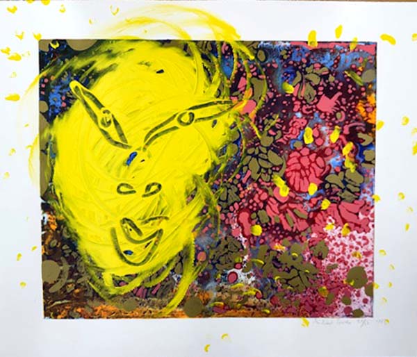 Buthe, Michael: Gartenblüten I. Druckgrafik-Multiple. o. O. o. V. 1993. 67 x 80,5 cm. 1 Blatt. Sehr gutes Exemplar. Druckgrafik-Multiple aus dem Spätwerk des deutschen Künstlers Michael Buthe (1944 – 1994). Aus der vierteiligen Serie „Gartenblüten“ aus dem Jahre 1993. Die kräftige Farbserigrafie auf glattem BFK Rives Büttenpapier wurde unikatär vom Künstler mit Acrylfarben blattfüllend überarbeitet. Aus einer Edition von 50 arabisch nummerierten Exemplaren, hier Exemplar Nr. 38/50. Vom Künstler unten rechts unterhalb des grafischen Bildmotivs in Bleistift nummeriert, datiert und signiert.