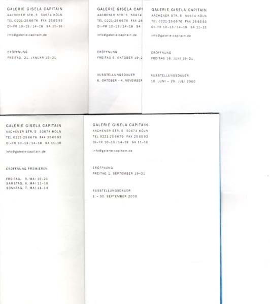 [Capitain, Gisela (Herausgeberin)]: Konvolut von fünf Ausstellungsfaltplakaten. Erste Auflage. Köln. Galerie Gisela Capitain. 2000. Diverse Formate bis 62 x 48 cm. 5 Blatt. Plakate ganz leicht knittrig. Jeweils zweifach zum Versand gefaltet. Sonst gute Exemplare. Kleines Konvolut von fünf Ausstellungsfaltplakaten, auf glattem, leichten Karton, der Kölner Galerie Gisela Capitain zu Einzelausstellungen verschiedener Künstler. Es liegen Plakate vor von Rachel Khedoori, Johannes Wohnseifer, Maria Brunner, Albert Oehlen und Christopher Williams. Alle Plakate recto mit jeweils einer Farbabbildung nach einer Arbeit bzw. einem Entwurf des jeweiligen Künstlers, der jeweiligen Künstlerin.