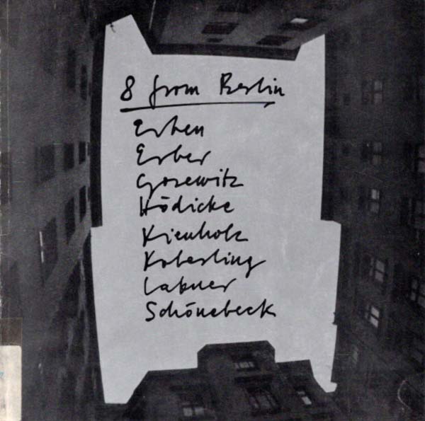 8 from Berlin. Erben, Erber, Gosewitz, Hödicke, Kienholz, Koberling, Lakner, Schönebeck. Neuer Berliner Kunstverein, 10. Dezember 1975-8. Januar 1976. Erste Auflage. Berlin. Neuer Berliner Kunstverein. 1975. 21 x 21 cm. [52] S. Illustrierter OKarton. Stempel des Museum Folkwang auf Titel. Bibliotheksaufkleber auf Buchrücken. Sonst noch gutes Exemplar. Texte in Deutsch und Englisch. Mit einem Beitrag von Heinz Ohff. Durchgehend mit Abbildungen versehen, teilweise in Farbe.