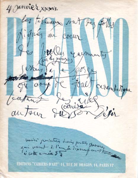 Picasso, Pablo – Christian Zervos (Herausgeber): Picasso 1930 – 1935. Erste Auflage dieser Ausgabe. Paris. Éditions „Cahiers d’Art“. [1936]. 32 x 25,4 cm. 108 S. Illustrierter OKarton mit transparentem OPergaminumschlag. Pergaminumschlag nachgedunkelt, angestaubt und randläsurig. Kleine Fehlstelle am Fuß. Rücken stärker nachgedunkelt und lesespurig. Umschlag leicht nachgedunkelt. Kleine Stauchung am Fuß. Bindung angelockert. Sonst noch gutes Exemplar. Durchgehend mit schwarz-weißen Abbildungen versehen. Separatausgabe der Nummern 7 – 10 der von Christian Zervos in Paris herausgegebenen „Cahiers d’Art“ aus dem Jahre 1936, Pablo Picasso gewidmet. Wie in der ursprünglichen Nummer mit dem auf starkem Karton montierten Porträt von Pablo Picasso nach einer schwarzweißen Fotografie von Man Ray, hier ohne die faksimilierte Signatur. Mit den Essays von Christian Zervos: „Fait social et vision comique“, Paul Éluard: „Je parle de ce qui est bien“, André Breton: „Picasso poète“, Man Ray: „Dictionnaire panoramique de Pablo Picasso“, Salvador Dalí: „Les pantoufles de Picasso“ sowie Georges Hugnet: „L’Iconoclaste“. Mit neun ganzseitigen Bildtafeln auf festem Karton mit Arbeiten Picassos, davon acht schwarzweiß, eine farbig.