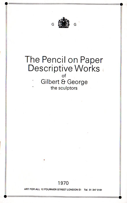Gilbert & George: The Pencil on Paper. Descriptive Works of Gilbert & George the sculptors. London. Selbstverlag Art for All. 1970. 20,5 x 12,5 cm. 12 S., 4 Tafeln. OKarton. Einband insgesamt etwas nachgedunkelt und vorne gering fleckig. Sonst gutes Exemplar. Erste Publikation des Londoner Künstlerduos in 500 handschriftlich nummerierten Exemplaren, hier Nummer 105. Mit vier Selbstporträts auf Tafeln und einem Text, der fortlaufend ohne Punkt und Komma, aus einem Satz bestehend, die Zeichnungen erklärt. Das Buch in seiner Gesamtheit betrachten die Künstler als „Skulptur“. Auf der letzten Seite der rote Signetstempel der Künstler. [Vgl. Künstler-Bücher I, S. 66, Nr.1; Kat. Gilbert & George 1968 to 1980, S. 67].