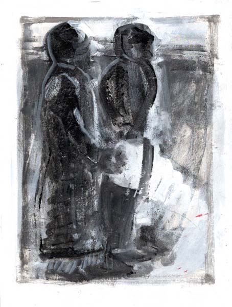 Hartmann, Thomas: Zwei Personen. 1 Blatt. Sehr gutes Exemplar. Acryl und Gouache auf Papier. 27 x 21 cm, verso signiert und datiert August 1987.