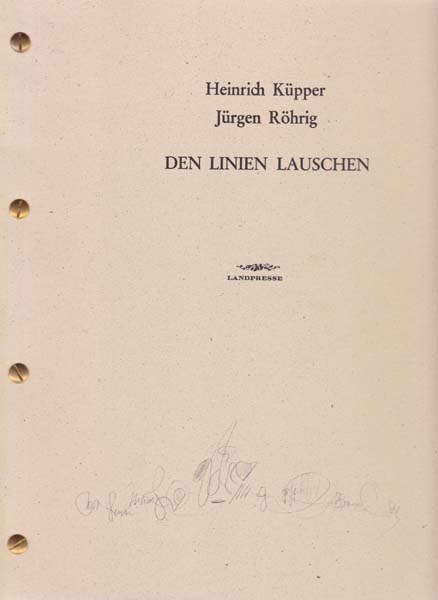 Küpper, Heinrich – Jürgen Röhrig: Den Linien lauschen. Auflage 250 Exemplare. Weilerswist. Verlag Landpresse. 1996. 29,5 x 23 cm. 22 Blatt. OKarton mit Schraubenbindung. Rücken minimal lichtrandig. sonst sehr gutes Exemplar. Mit 19 ganzseitigen Illustrationen von Jürgen Küpper. Hier Nr. 276 von 250 Exemplaren (?).