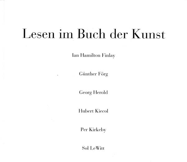 Lesen im Buch der Kunst. Ian Hamilton Finlay Günther Förg Georg Herold Hubert Kiecol Per Kirkeby Sol Lewitt- Erste Auflage. Karlsruhe. Badische Landesbibliothek. 1995. 21 x 24 cm. 45 S. OKarton. Einbandkanten etwas lichtrandig und mit kleinen Bereibungen. Sonst gutes bis sehr gutes Exemplar. Katalog zur Ausstellung Karlsruhe 18. Oktober bis 30. Dezember 1995 durchgehend mit Werkabildungen der genannten Künstler versehen.