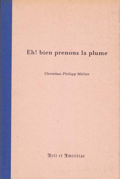 Müller, Christian Philipp [Herausgeber/ Editor]: EH! bien prenons la plume. Nieuwe leden voor een honderdvijftigjarig idee. Neue Mitglieder für eine hunderfünfzigjährige Idee. Auflage 1000 Exemplare. Amsterdam. Arti et Amicitiae. 1988. 24,5 x 16,5 cm. 95 S. OHLeinen. Einbanddeckel mit kleinen Bereibungen, etwas lichtrandig und fleckig. Sonst gutes Exemplar. Erschienen zur Jahresausstellung neuer Mitglieder für 1988 der 1839 in Amsterdam gegründeten Künstlervereinigung „Arti et Amicitiae“, darunter Rob Scholte, Lawrence Weiner, Marina Abramovic und Rene Daniels. Durchgehend mit Abbildungen versehen. Text in niederländischer und edeutscher Sprache, englisches Textheft inliegend (dieses etwas knickspurig).