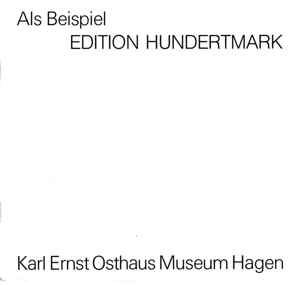 Hundertmark, Arnim: Als Beispiel EDITON HUNDERTMARK. Erste Auflage. Hagen. Karl Ernst Osthaus Museum Hagen. 1983. 20 x 20 cm. 40 S. OBroschur. Einbandkanten etwas lichtrandig und mit minimalen Bereibungen. Sonst gutes bis sehr gutes Exemplar. Katalog zur Ausstellung Hagen 26. 2. bis 3. 4. 1983 durchgehend mit Abbildungen versehen. Inliegend 13seitiger, kopierter Katalog „Neuerscheinungen“ der Edition Hundertmark.