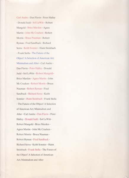 The Future of the object. A selection of American Art; Minimalism and After. Auflage 3000 Exemplare. Antwerpen. Galerie Ronny van de Velde. 1990. 30 x 24 cm. 261 S., 1 Blatt. OPappband mit illustriertem OUmschlag. Umschlag mit kleinen Randeinrissen und -bereibungen, gering lichtrandig. Sonst gutes Exemplar. Umfangreicher Ausstellungskatalog mit sehr zahlreichen Abbildungen versehen. Text in englischer und französischer Sprache.