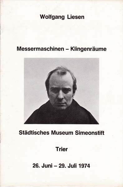 Liesen, Wolfgang: Messermaschineb – Klingenräume. Erste Auflage. Trier. Städtisches Museum Simeonstift. 1974. 24 x 16 cm. 16 unpaginierte S. Illustrierte OBroschur. Einbandkanten etwas lichtrandig und mit kleinen Bereibungen. Gutes bis sehr gutes Exemplar. Katalog zur Ausstellung Trier 26. Juni bis 29. Juli 1974 durchgehend mit Abbildungen, Ausstellungsverzeichnis, Bio/ und Bibliographie versehen.