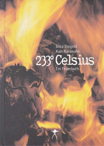 Bargeld, Blixa – Kain Karawahn: 233 Grad Celsius. Ein Feuerbuch. Herausgegeben von Maria Zinfert. Erste Auflage. Tübingen. Konkursbuchverlag. 1999. 24,5 x 17,5 cm. 128 S. Illustrierter OPappband. Gutes bis sehr gutes Exemplar. Durchgehend mit Bildern zu der in Berlin 1997 stattgefundenen Performance von Blixa Bargeld und Kain Karawahn, wo 7000 aus unterschiedlichen Gründen aussortierte Bücher verbrannt und dokumentiert wurden.